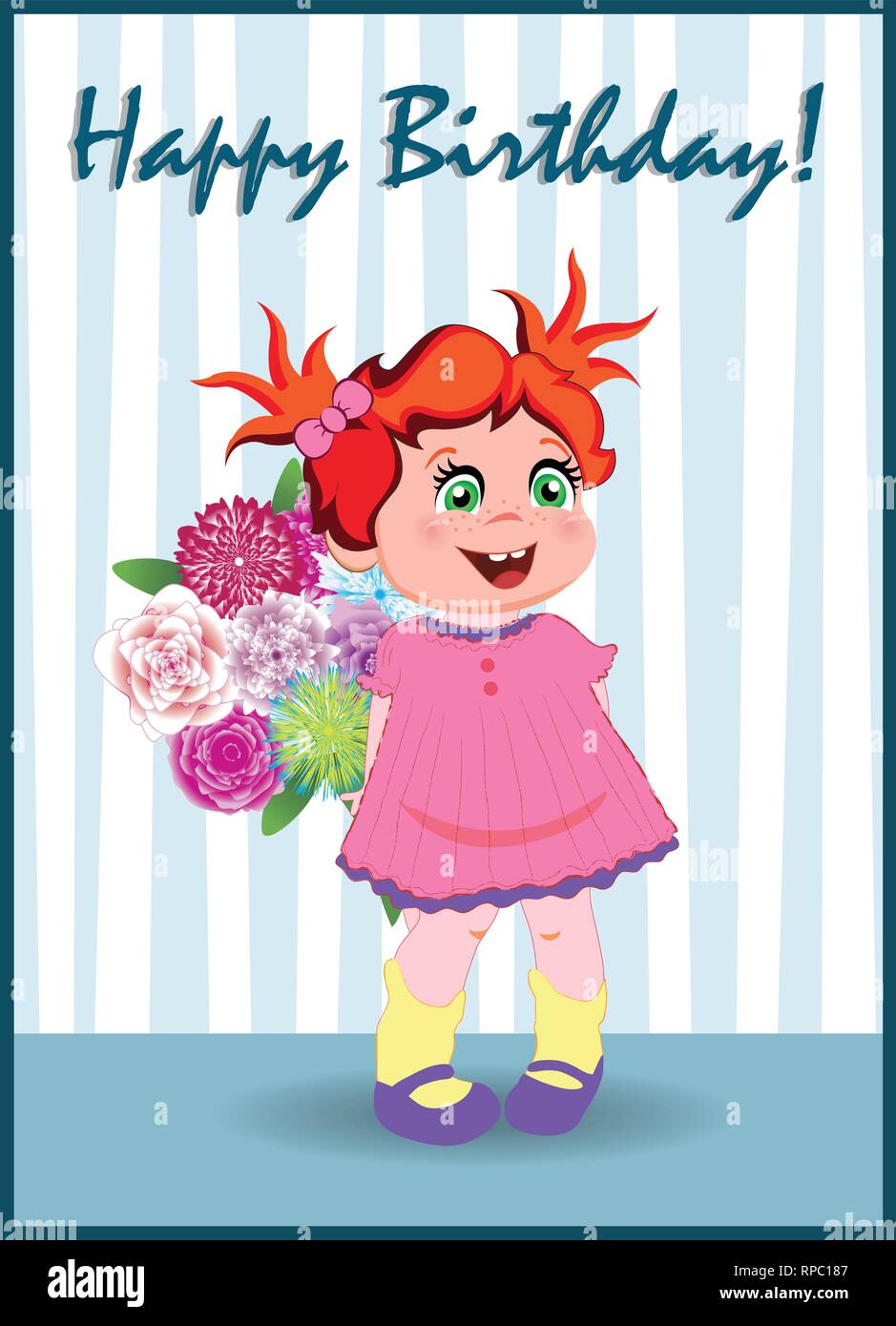 Carte De Vœux De Joyeux Anniversaire Jolie Petite Tete Rouge Fille En Robe Rose Avec Des Tas De Belles Fleurs Stand Dans La Salle Avec Papier Peint A Rayures Kawaii Baby Image